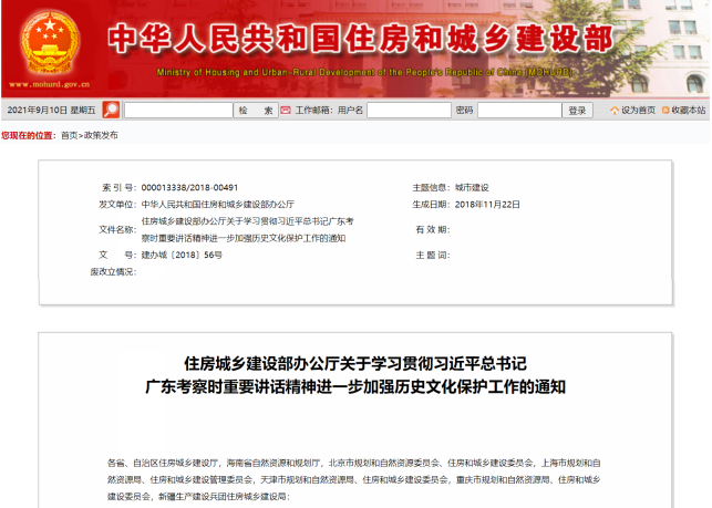 2018年底,住房和城鄉(xiāng)建設部印發(fā)《關于學習貫徹習近平總書記廣東考察時重要講話精神進一步加強歷史文化保護工作的通知》(建辦城〔2018〕)56號。