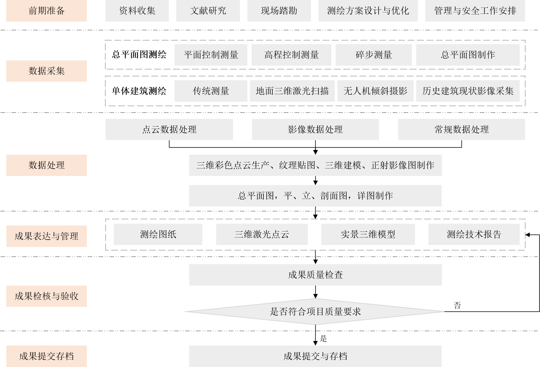 歷史建筑測繪的工作流程分為前期準備、數(shù)據(jù)采集、數(shù)據(jù)處理、成果表達與管理、成果檢核與驗收、成果提交存檔等五個階段。