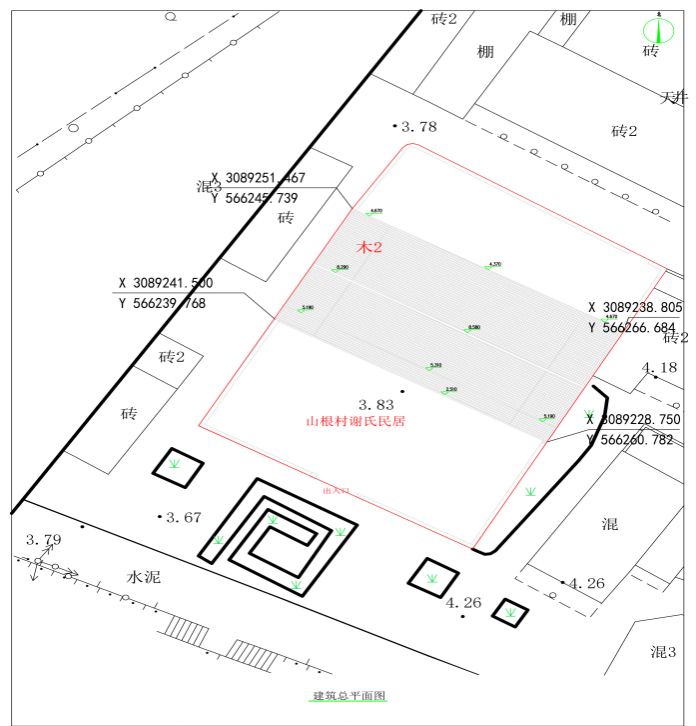總平面圖:繪制建筑輪廓、周邊建筑或構(gòu)筑物、道路、廣場、水域、山體、綠化等環(huán)境信息,且完整覆蓋歷史環(huán)境要素;標注建筑總尺寸,建筑與相鄰建筑物、構(gòu)筑物的距離;場地標高與建筑、構(gòu)筑物的標高,平屋面建筑標注天面、女兒墻的標高,坡屋面建筑宜標注屋脊、檐口下沿的標高;標注建筑名稱、出入口位置、層數(shù)、建筑高度、周邊建筑的層高、周邊道路、廣場名稱等信息。