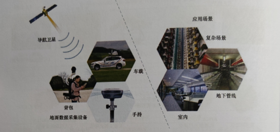 針對城市中復(fù)雜場景、室內(nèi)、地下管線等衛(wèi)星遙感以及航空攝影手段難以獲取數(shù)控的對象,可在地面進行數(shù)據(jù)采集,如圖 2-2 所示。實景三維地面數(shù)據(jù)采集主要有車載背包、手持等方式,通過將激光掃描儀、影像采集設(shè)備、定位定姿設(shè)備、同步控制器等多傳感器集成于一體,并根據(jù)采集需求將設(shè)備搭載在測量車上,對建筑、道路進行高精度實景三維數(shù)據(jù)采集,或通過背包、手持的方式對室內(nèi)室外、地下管線進行數(shù)據(jù)采集。