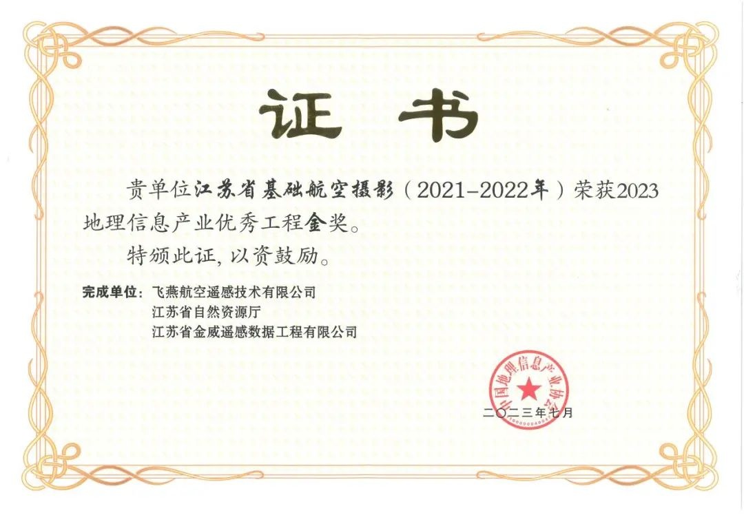 憑借《江蘇省基礎(chǔ)航空攝影》項(xiàng)目榮獲2023地理信息產(chǎn)業(yè)優(yōu)秀工程金獎(jiǎng)。
