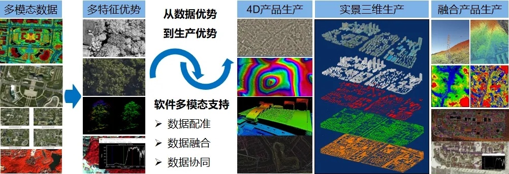 支持多源高分辨率影像聯(lián)合處理,通過對(duì)影像進(jìn)行空三、密集匹配、構(gòu)網(wǎng)、紋理映射,輸出Mesh實(shí)景三維模型,結(jié)合激光點(diǎn)云數(shù)據(jù),生成DSM、DEM、DOM、DLG等數(shù)據(jù)產(chǎn)品,豐富成果類型。
