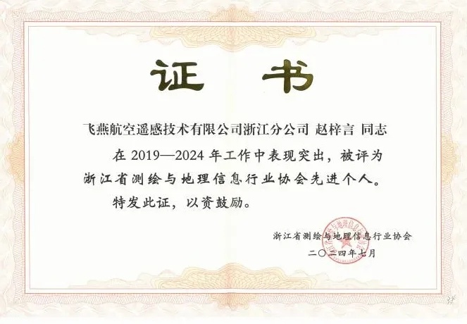 秉持“艱苦奮斗、開(kāi)拓創(chuàng)新、守望相助、永攀高峰”企業(yè)核心價(jià)值,飛燕遙感總經(jīng)理趙梓言榮獲浙江省測(cè)繪與地理信息行業(yè)協(xié)會(huì)先進(jìn)個(gè)人。