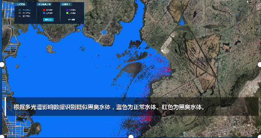 可對影像的高光譜信息對水體部分進行處理、分類,通過光譜反射率對比(反射率低為污染水體)將疑似黑臭水體部分標識為紅色,正常水體為藍色。通過不同年限的影像對比,獲取水體變化情況,紫色部分水體增多,綠色部分水體。