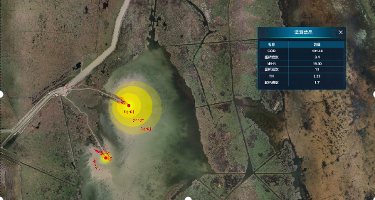通過水下污染物檢測傳感器結(jié)合地理信息數(shù)據(jù)對排污口進行實時的監(jiān)控,從該頁面可以看到排污口污染物排放超標情況,以及隨著時間推移,污染物的擴散情況。