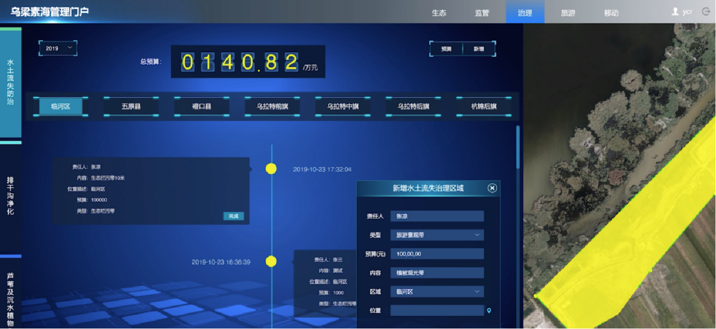 新增了水土流失防治蘆葦以及沉水植物收割、排干溝凈化等方面,了解整年度水土流失工程防治及完成情況,對每個生態(tài)環(huán)保項目的負責人、經(jīng)費預算以及區(qū)域面積等信息進行詳細的統(tǒng)計展示。