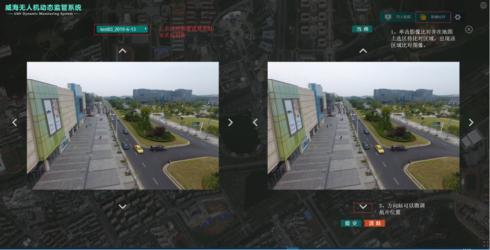 導(dǎo)入后的航片會(huì)在地圖上顯示。選擇相應(yīng)的比對(duì)與待比對(duì)航片,可以對(duì)同地區(qū)不同時(shí)段航片作比較,以發(fā)現(xiàn)地區(qū)地物變化情況,框選出地物差異點(diǎn),并編輯描述信息,可保存在系統(tǒng)后臺(tái)。