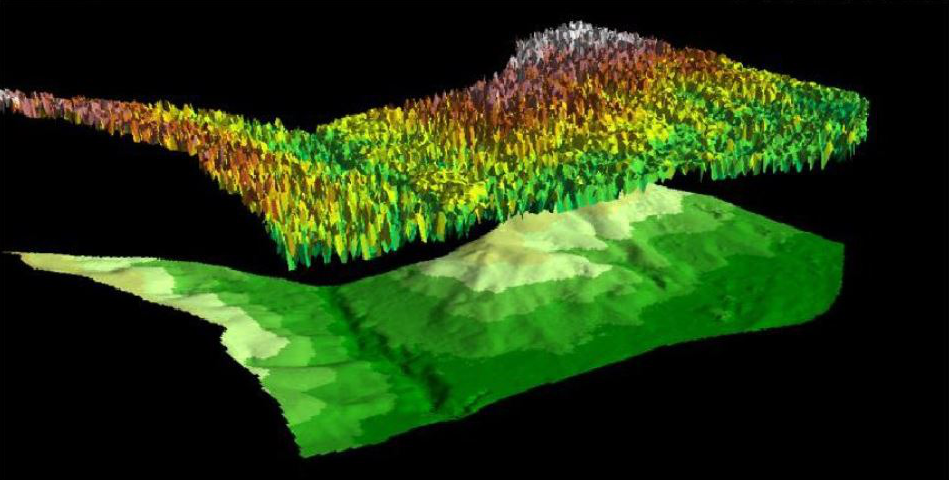 Lidar技術(shù)通過主動(dòng)遙感方式,具有一定的地表物體穿透力,通過載人飛機(jī)搭載Riegl 1560i激光掃描儀對森林地區(qū)進(jìn)行全波段、多波形的點(diǎn)云數(shù)據(jù)獲取,掃描儀所包含的飛思工業(yè)級相機(jī)可以同期獲取影像數(shù)據(jù),方便后期進(jìn)行地物點(diǎn)云分類。可以更加精細(xì)地獲取森林三維空間結(jié)構(gòu)模型(如DCHM),再通過進(jìn)一步定量分析,獲取森林蓄積量、冠層高度、胸徑、郁閉度等相關(guān)信息。可以大幅度減少人工調(diào)查工作量,提高森林資源調(diào)查的效率和精度。