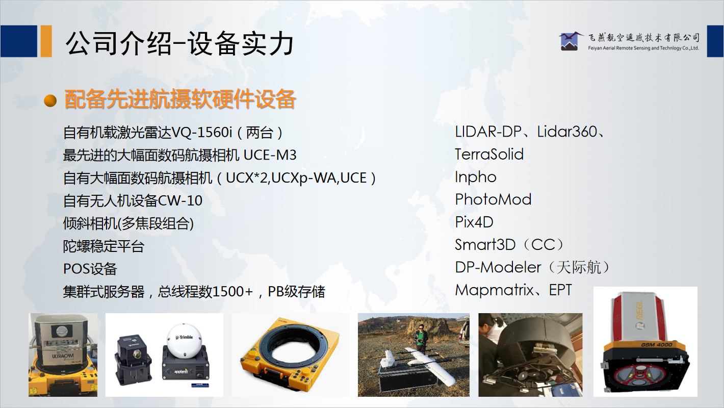 飛燕遙感配備兩臺機載激光雷達VQ-1560i、一臺5億像素傾斜攝影相機、五臺大幅面高精度UC系列數碼航攝儀、多種無人機及輔助設備,是全國航攝設備裝備最頂尖的企業(yè)之一。