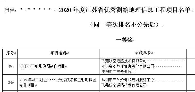 本次評選由江蘇省測繪地理信息學(xué)會組織,根據(jù)《江蘇省優(yōu)秀測繪地理信息工程評選辦法》,專家委員會對244個申報2020年度江蘇省優(yōu)秀測繪地理信息工程獎的項目進(jìn)行了評審。飛燕遙感完成的“溧陽市正射影像圖制作項目”和“2019年常武地區(qū)LiDAR數(shù)據(jù)獲取和正射影像圖制作項目”被評為2020年度江蘇省優(yōu)秀測繪地理信息工程一等獎。