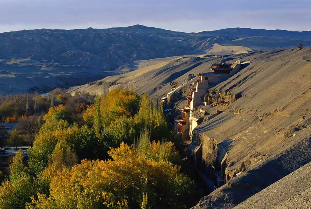 如今的莫高窟,除了正門處的地標(biāo)“九層樓”之外,最顯眼的莫過(guò)于莫高窟前茂密的胡楊林,每逢秋季,胡楊林映襯下的莫高窟都顯得格外詩(shī)意。